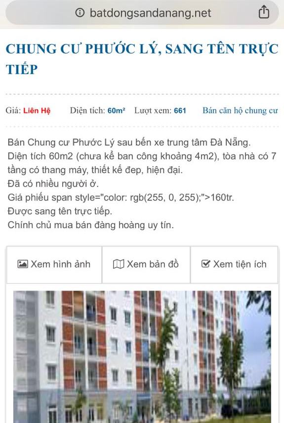 | Thời gian vừa qua, trên một số trang mạng xã hội, trang bất động sản đã xuất hiện thông tin về việc rao bán và cho thuê các căn hộ tại chung cư Phước Lý, thuộc phường Hòa An, quận Cẩm Lệ. |