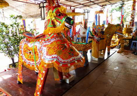 | Ngựa, thuyền rồng, lính canh làm bằng giấy tại lễ giỗ Thánh |