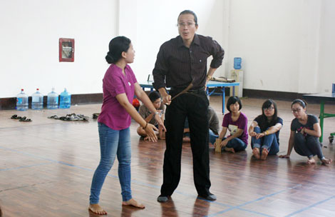 | Đạo diễn Lê Tuấn Cường đang thị phạm cho sinh viên diễn chèo. |