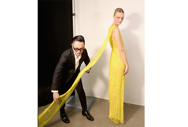 | Nhà thiết kế Công Trí chỉnh sửa váy cho người mẫu trong hậu trường bộ sưu tập “Cuộc dạo chơi của những vì sao”. |