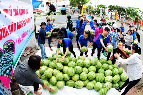 | Các bạn trẻ tham gia phong trào bán dưa hấu giúp nông dân Quảng Ngãi. |