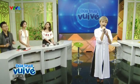 | Hot girl Mờ Navie biểu diễn và mạo nhận ca khúc “Điều em muốn nói” là của mình trong chương trình “Bữa trưa vui vẻ”. (Ảnh cắt từ clip). |