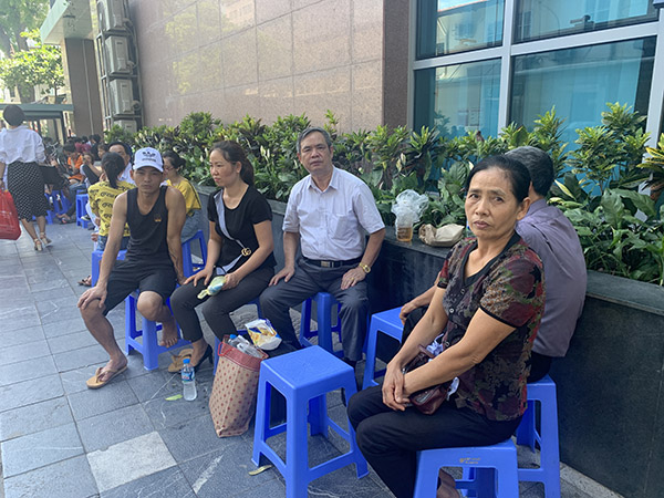 Tới BV Bạch Mai vào 10h trưa, nắng nóng rát mặt nhưng có rất nhiều người nhà chăm bệnh nhân ngồi ngoài trời chờ đợi. Trung bình một ngày bệnh viện khám cho 3.000 người. Khu vực khám bệnh và chờ khám đều bố trí ghế, quạt mát, người dân chờ đợi không quá vất vả. Tuy nhiên, người nhà đi chăm bệnh nhân vào giờ bác sĩ làm thuốc, thăm khám phải ra ngoài, trời nóng này là một khó khăn rất lớn.