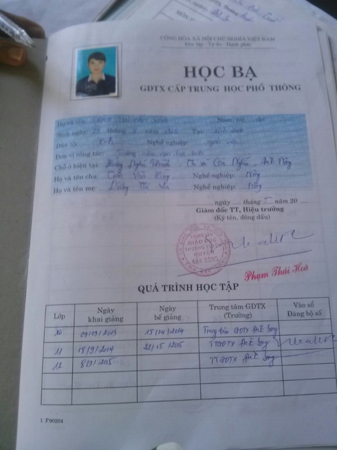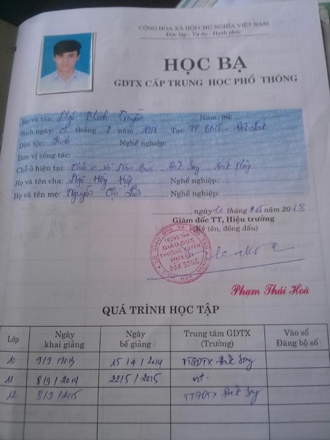 Liên quan đến việc ông Phạm Thái Hòa, Giám đốc Trung tâm Giáo dục thường xuyên (GDTX) huyện Đắk Song, tỉnh Đắk Nông bị tố cáo làm giả học bạ và chỉ đạo giáo viên cấp dưới của mình phải ký vào học bạ giả cho nhiều học viên, ngày 14-7, Công an tỉnh Đắk Nông cho biết, đang tiến hành điều tra, xác minh làm rõ sự việc.