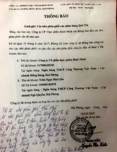 Một đại diện Nhà phân phối tại khu vực quận Hải An, Ngô Quyền cũng cho biết, từ đầu tháng 6-2017, sau khi nhận thông báo như nêu trên của Công ty Bình Minh nên đã chuyển trả tiền hàng theo đúng yêu cầu. Ngoài ra, các nhà phân phối K. (ở Hải Dương), Ch. (ở Nam Định), Th. (ở Hà Nội) cũng đều có xác nhận là năm 2017, họ đã nhận được thông báo như nêu trên và từ đó họ đã chuyển tiền trả tiền hàng cho Công ty Bình Minh vào 2 tài khoản.