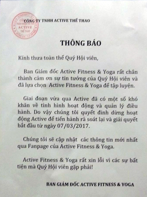 Chiều 6-3, trong khi hàng trăm hội viên của Active đang tập luyện bình thường thì bất ngờ nhân viên của trung tâm này dán thông báo sẽ đóng cửa, ngừng hoạt động để tiến hành sửa chữa. Nội dung thông báo ghi: "Giai đoạn vừa qua, Active đã có một số khó khăn về tình tình hoạt động và quản lí điều hành. Do vậy, chúng tôi quyết định dừng hoạt động của Active để tiến hành rà soát lại".
