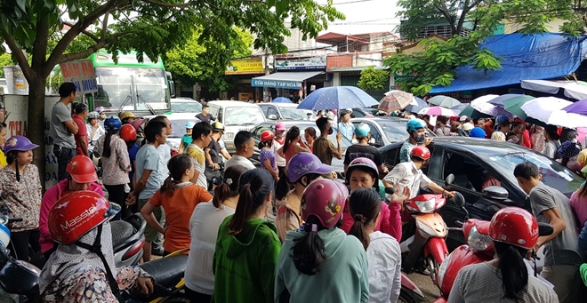 | Hàng nghìn công nhân tập trung ngoài đường khiến giao thông tắc nghẽn. |