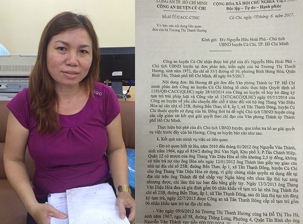 | Bà Hương đến Báo CAND cầu cứu và kết quả xác minh vụ việc liên quan đến bà Hương (văn bản do Công an huyện Củ Chi cung cấp). |