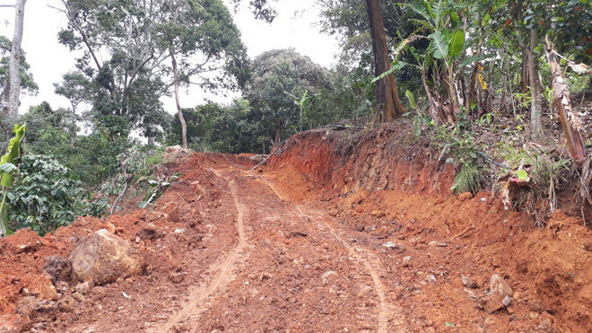 Đặc biệt, khu vực này là rừng tự nhiên, thuộc đối tượng rừng phòng hộ nhưng hiện đã bị tác động, san gạt, có vị trí đơn vị thi công múc đất, gây chênh lênh địa hình 3-4m, khoét sâu vào sát gốc nhiều cây gỗ lớn. Việc tác động, làm thay đổi hiện trạng con đường, gây chênh lệch địa hình đang có nguy cơ dẫn đến sạt lở đất và cây rừng.