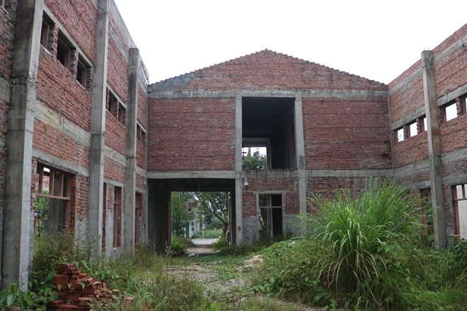 | Dự án nhà văn hoá và sân vận động tại xã Lâm Động, huyện Thuỷ Nguyên đang xây dựng dở dang để cỏ mọc. |