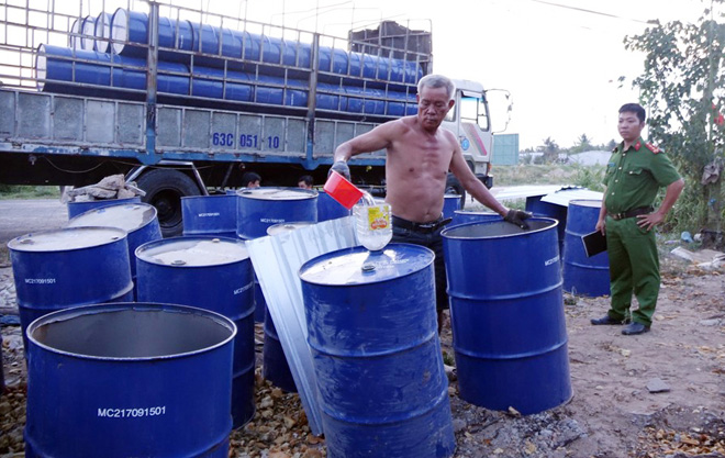 Trước đó, vào chiều 28-4, các trinh sát phát hiện quả tang ông Trần Văn Thảo (38 tuổi, ngụ khu vực 2, phường Ba Láng, quận Cái Răng, TP Cần Thơ) cùng với 3 nhân công khác đang cắt nắp các thùng phuy sắt loại 200 lít, sau đó múc dung dịch màu vàng trong các thùng phuy đổ vào các thùng phuy khác tại một khu đất trống trên đường Võ Nguyên Giáp (khu vực Phú Tân, phường Tân Phú, quận Cái Răng).