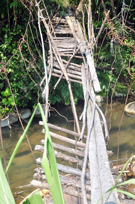 Khi đi trên những cây cầu treo mà thường ngày của người dân thường hay qua lại và gọi là cầu “rón rén” này, quả thật vì không phải là người “bản địa”, nên chúng tôi phải vừa đi vừa dò nếu không muốn lọt xuống suối khi qua cầu.