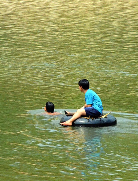 | Người dân làng Tắc Rối dùng ruột xe bơm căng làm phương tiện vượt sông. Ảnh Hữu Phúc. |