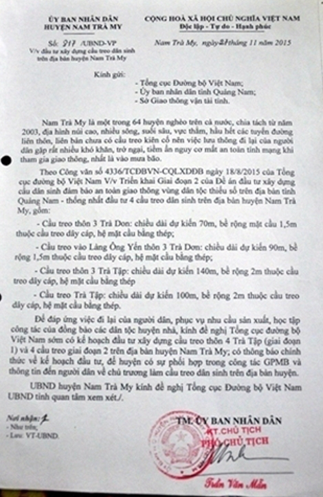 | Văn bản của huyện Nam Trà My gởi Tổng Cục đường bộ và cơ quan chức năng tỉnh Quảng Nam về việc xây cầu treo. |