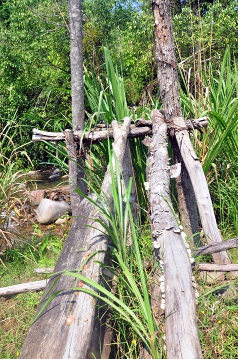 Dây an toàn duy nhất đối với chúng tôi, cũng được gọi là “lan can cầu” chỉ là 2 sợi thép cột vào 2 gốc cây ở 2 bên suối, còn ván cầu bên dưới được lát những mảnh gỗ tạm bợ. “Đường dẫn” lên cầu thì chỉ kê mấy cây gỗ mục, khiến người đi trên nó mỗi bước chân là mỗi lần phải “rón rén” .