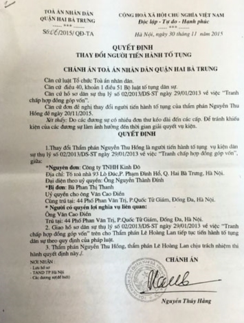 Ngày 30-11, Chánh án TAND quận Hai Bà Trưng ban hành Quyết định số 06/2015/QĐ-TA thay đổi người tiến hành tố tụng. Quyết định thay đổi Thẩm phán Nguyễn Thu Hồng là người tiến hành tố tụng vụ kiện dân sự thụ lý số 02/2013/DS-ST ngày 29-1-2013, giao hồ sơ trên cho Thẩm phán Lê Hoàng Lan tiếp tục tiến hành tố tụng.