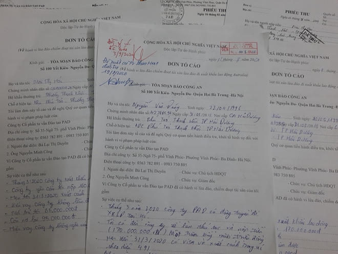 | Đơn của người lao động tố cáo Công ty Cổ phần tư vấn đào tạo PAD lừa đảo đưa người lao động sang Úc làm việc. |