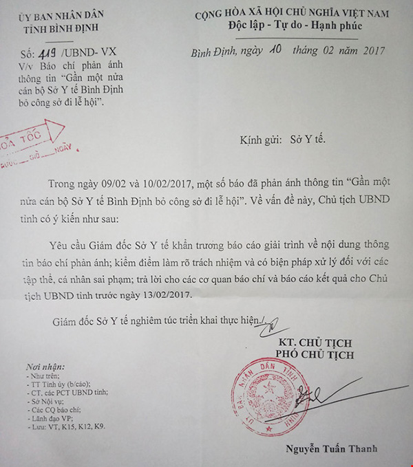| Công văn của UBND tỉnh Bình Định yêu cầu giải trình vụ việc 22 cán bộ - công chức bỏ công sở đi dự lễ. |