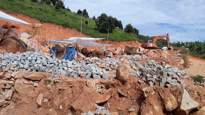Để khai thác đá, chủ các khu mỏ bất hợp pháp này đã đưa máy múc vào đào sâu xuống lòng đất, đưa từng tảng đá lớn lên. Từ đó, những người thợ bắt đầu dùng khoan xẻ nhỏ từng phiến đá lớn. Mỗi địa điểm khai thác đá thường có từ vài người tới vài chục người. Đá được chủ các khu mỏ thu mua lại từ các thợ được thuê chẻ dao động khoảng 2.000 đồng/viên, chở lên TP Đà Lạt bán tới tay người tiêu dùng trung bình 6.000 đồng/viên, kích thước 20x30cm. Mỗi ngày, một người thợ chẻ đá lành nghề có thể chẻ được khoảng 300 viên. Vị trí tác động tại các địa điểm khai thác đá bất hợp pháp ở tiểu khu 243, xã Phi Tô, huyện Lâm Hà có diện tích từ vài sào tới cả hecta. Để phục vụ việc khai thác, vận chuyển đá ra khỏi các khu mỏ, nhiều địa điểm đã được “chủ đầu tư” lát đá chẻ lên mặt đường.