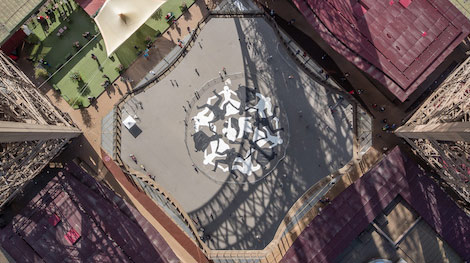 Chủ đề của bức bích họa khổng lồ cách tầng đầu tiên của tháp Eiffel 57m (ảnh), thể hiện tình đoàn kết keo sơn giữa các dân tộc bất chấp màu da và bản sắc văn hóa.