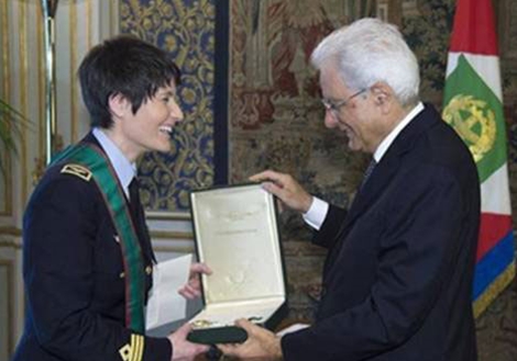 | Tổng thống S. Mattarella (phải) trao tặng Huân chương Công trạng cho nữ phi hành gia cự phách. |