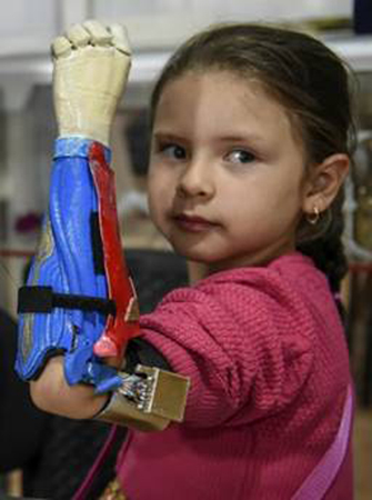 | Cô bé 6 tuổi Shaio Valeria Novas ở Colombia bị dị tật bẩm sinh nơi bàn tay trái vừa được công ty in 3D Fabrilab trao tặng bộ phận giả màu xanh và đỏ như nhân vật siêu anh hùng. |