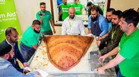 Sự việc diễn ra vào ngày 23-8 vừa qua tại khuôn viên một nhà thờ Hồi giáo ở phía đông London. 12 tình nguyện viên đã tiến hành các công đoạn làm bánh như nhào bột, trộn nhân hỗn hợp gồm khoai tây, hành và đậu que tạo thành chiếc bánh gối khổng lồ hình tam giác, trước khi đặt vào dây lưới chuyên dụng nhúng xuống thùng dầu ăn chiên đều.