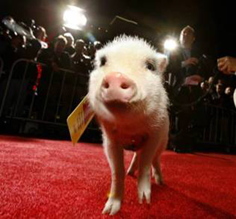 Trong ảnh là chú lợn ngộ nghĩnh với bộ lông trắng, được mọi người trìu mến gọi bằng cái tên Albert đang đĩnh đạc dấn bước trên tấm thảm đỏ danh dự, tham gia lễ ra mắt bộ phim mang tựa đề "College Road Trip" (Du ngoạn đến trường), được tổ chức tại cụm rạp chiếu bóng nổi tiếng El Capitan Theatre ở kinh đô điện ảnh Hollywood.