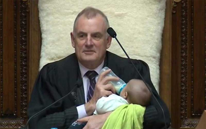 Trong ảnh là ông Trevor Mallard, đương kim Chủ tịch Hạ nghị viện New Zealand đang cho một đứa trẻ bú sữa bình tại phiên họp toàn thể ngày 23-8. Sự kiện thú vị này được truyền hình trực tiếp, lôi cuốn khán giả chăm chú theo dõi.