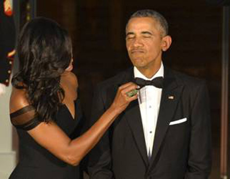 Trong ảnh là cựu Đệ nhất phu nhân Hoa Kỳ Michelle Obama đang chỉnh trang lại phục sức cho chồng, chuẩn bị nghênh đón phái đoàn Trung Quốc do Chủ tịch Tập Cận Bình dẫn đầu thăm Nhà Trắng dạo cuối tháng 9-2015.