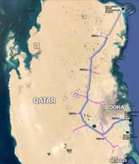 Trong ảnh là sơ đồ mạng lưới đường ống khổng lồ, cung cấp cho hệ thống bể chứa nước liên hoàn có tổng dung tích là 17 triệu m³, sẽ được chính quyền Nhà nước Qatar khánh thành vào đầu quý 2 tới đây, trở thành hệ thống tích trữ nước nhân tạo lớn nhất thế giới.