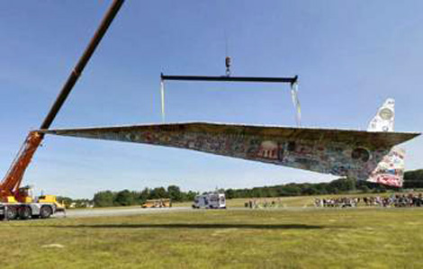 Nguyên liệu chính của dự án do Công ty Cracker, cũng là nhà sản xuất giấy lâu đời ở Fitchburg cung cấp với 3 cuộn giấy trắng thành phẩm, nặng tổng cộng là 906kg. Dưới sự hỗ trợ của gần 5.000 người bao gồm các họa sĩ chuyên nghiệp, thợ mộc đóng khung gỗ, thợ dán giấy lành nghề và các tình nguyện viên, đã phối hợp cùng nhau miệt mài làm việc trọn cả tháng ròng để hoàn thành công trình khổng lồ, với hình dáng y như một chiếc máy bay xếp giấy cực lớn.