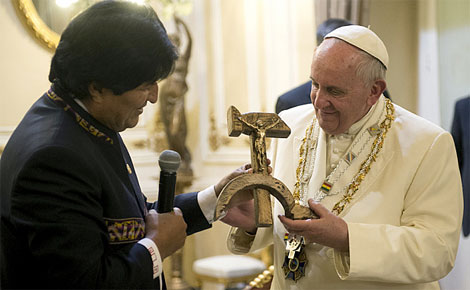 Cụ thể trong buổi tiếp kiến chính thức người đứng đầu Giáo hội Công giá La Mã, diễn ra tại Dinh Tổng thống ở trung tâm thủ đô La Paz vào buổi tối cùng ngày, Tổng thống Evo Morales đã thay mặt Ban lãnh đạo đảng Phong trào Xã hội chủ nghĩa vì lợi ích của nhân dân (MAS) đương quyền, do ông sáng lập và làm thủ lĩnh từ năm 1998 đã trân trọng trao cho Giáo hoàng Francis một tặng phẩm đặc biệt, khiến vị khách quý hết sức ngỡ ngàng và tiếp nhận trong sự bồi hồi cảm động.