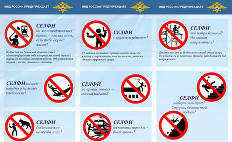 Bên trong tờ rơi là các hình vẽ được minh họa giống như những tấm biển báo, kèm lời giải thích cụ thể về những vị trí hay địa điểm có thể đe dọa đến tính mạng của người chụp, như gần đường giao thông, gần khu vực có động vật hoang dã; gần cột điện, tàu thuyền, mái nhà, cầu thang lên dốc; hoặc cầm vũ khí trong tay… Thậm chí bên dưới nhiều biển báo còn nêu những trường hợp cụ thể, từng bị tử vong khi đang “tự sướng” ở vị trí tương ứng.