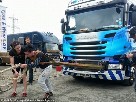 Trong ảnh là Katherine Bartlett 31 tuổi, thợ làm đầu ở thành phố Southampton, địa hạt Hampshire đang dùng sức mạnh dịch chuyển chiếc xe tải nặng 27 tấn, đoạt danh hiệu Người phụ nữ khỏe nhất Vương quốc Anh năm 2015.
