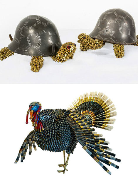 Con báo to như thật, con công đang xòe cánh và con rùa thể hiện bằng chiếc nón sắt của binh lính là một phần trong bộ sưu tập nghệ thuật được sáng tác với những vỏ đạn của Federico Uribe được triển lãm vừa qua (kết thúc vào ngày 11-6 nhưng được gia hạn thêm đến cuối tháng 7) tại Adelson Galleries ở thành phố New York (Mỹ).