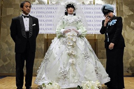 Nhà thiết kế trang phục cô dâu nổi tiếng người Nhật Bản Yumi Katsura (phải), vừa cho trình làng bộ sưu tập mới bằng phương thức độc đáo: thay vì các cô người mẫu "bốc lửa" lại là một robot có tên "Mime" (Người giỏi bắt chước - theo Anh ngữ).