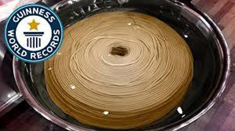 Sợi mì thành phẩm dài thượt xếp gọn trong một chiếc chảo chuyên dụng khổng lồ, được ông John Guinness, đại diện Sách Kỷ lục Guinness chứng kiến toàn bộ quá trình chế biến, đã chính thức xác nhận kỷ lục mới.