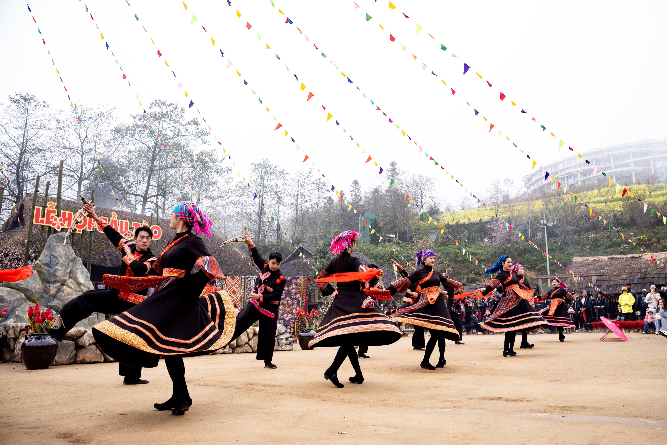 Hàng nghìn du khách đã tụ hội về quần thể tâm linh tại Fansipan để thực hiện nghi lễ dâng hoa, tắm Phật và tụng kinh cầu quốc thái dân an. Điểm nhấn thu hút nhất chính là Bản Mây, nơi tái hiện sống động các lễ hội truyền thống như Lễ hội Gầu Tào của người Mông (từ mùng 3 đến mùng 5 Tết) với các trò chơi dân gian như đi cà kheo, leo cột mỡ… Nghi lễ Thượng cờ trên đỉnh cao 3.143m diễn ra trong niềm xúc động tự hào, đánh dấu khoảnh khắc khởi đầu năm mới thiêng liêng trên "Nóc nhà Đông Dương".