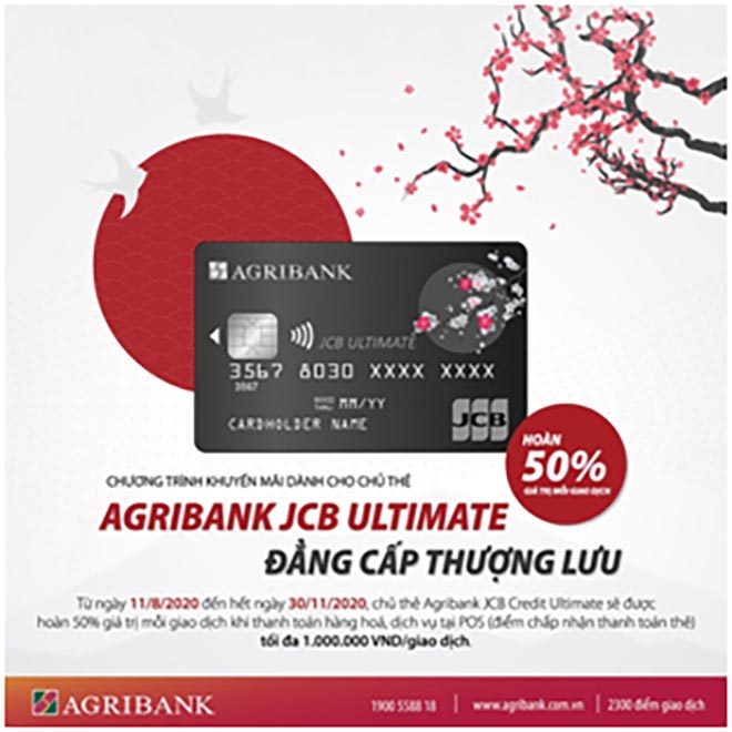 Chủ thẻ Agribank JCB Ultimate được hoàn tiền đến 50% khi thanh toán
