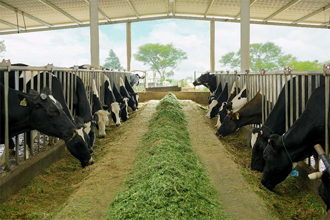 Theo tiêu chuẩn, ngay sau khi cắt, cỏ được băm nhỏ và trộn đều với cám hỗn hợp, các loại thức ăn bổ xung để làm khẩu phần hoàn chỉnh giúp bò tiêu hóa tốt và khỏe mạnh. Bò được cho ăn tự do cả ngày.