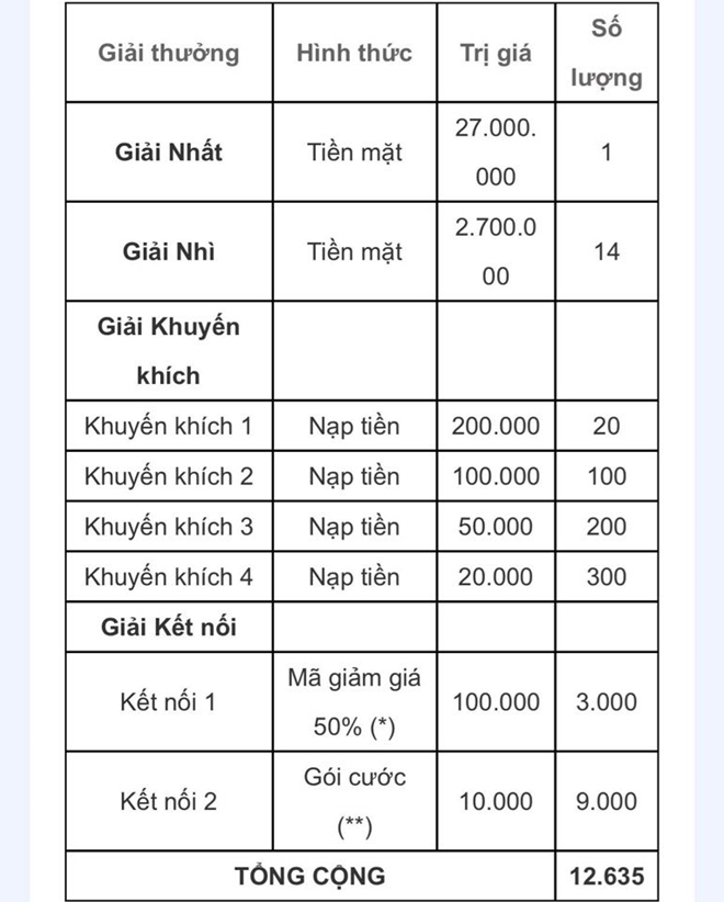 Tương ứng với mỗi giao dịch trị giá 50.000 đồng, thuê bao sẽ nhận được 01 lượt quay thưởng (không tính số dư). Ví dụ: Giá trị giao dịch của khách hàng là 120.000đ, thì số lượt = 2; Giá trị giao dịch của khách hàng là 210.000đ, thì số lượt = 4.