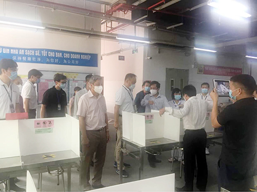 Kiểm tra trực tiếp các khu vực dễ phát sinh tiếp xúc gần như nhà việc sinh, phòng ăn, phòng y tế, xưởng làm việc… công ty đã chuẩn bị tương đối đầy đủ có vách ngăn theo theo quy định giãn cách. Thứ trưởng Bộ Y tế đặc biệt lưu ý công tác đảm bảo an toàn phòng chống dịch của công ty và đề nghị công ty, khi tất cả lao động quay trở lại làm việc cần cài đặt ứng dụng Bluezone.