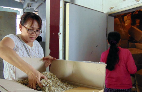 | Bà Hiền cùng các lao động lấy cá khô từ kho đông lạnh chuẩn bị xuất cho các đại lý. |