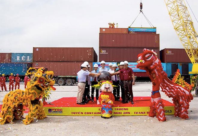 | Lễ khai trương tuyến vận tải hàng container nội địa từ Cảng Nghi Sơn đi Cảng Bến Nghé (TP HCM). |