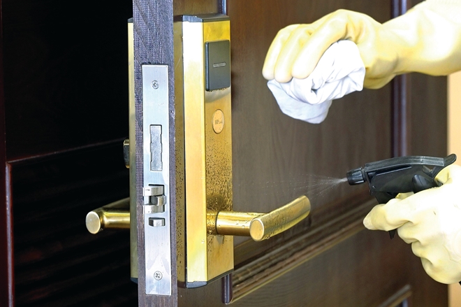 | Toàn bộ các bề mặt tiếp xúc có nguy cơ đều được lau dọn 2h/lần bằng dung dịch. |