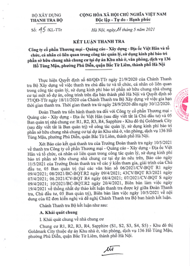 Kết luận thanh tra số 45/KL-TTr cũng chỉ ra Chủ đầu tư và 05 Ban quản trị đã cơ bản thực hiện công tác quản lý, sử dụng kinh phí bảo trì phần sở hữu chung nhà chung cư phù hợp quy định của Luật Nhà ở năm 2014, Nghị định số 99/2015/NĐ-CP ngày 20/10/2015 của Chính phủ quy định chi tiết và hướng dẫn thi hành một số điều của Luật Nhà ở, Nghị định số 30/204/NĐ-CP ngày 26/3/2021 của Chính phủ sửa đổi bổ sung một số điều của Nghị định số 99/2015/NĐ-CP ngày 20/10/2015 của Chính phủ và các thông tư hướng dẫn về quy chế quản lý, sử dụng nhà chung cư.