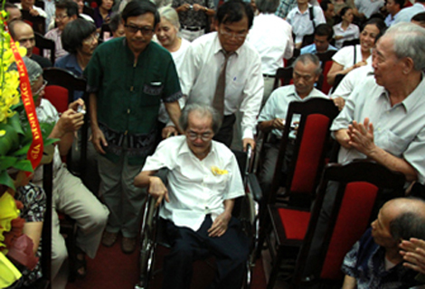 | Nhà văn Sơn Tùng xúc động ngồi trên xe lăn đi vào hội trường nhận Huân chương anh hùng lao động trong sự chào đón và chúc mừng của nhiều bạn bè, đồng nghiệp. |