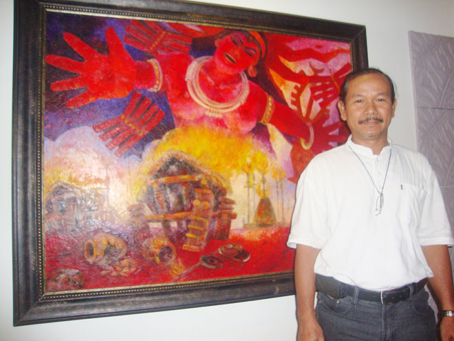 Chủ quán cũng là một họa sĩ trẻ. Đó là Hồ Hậu (hội viên Hội VHNT Đắk Lắk). Anh chỉ lên bức tranh treo ở giữa nhà nói tác phẩm của Inhi dựng hình ảnh một người đàn bà (biểu tượng cho thần mặt trời) nổi giận trước hiểm họa suy tàn của môi trường do con người gây ra. Một không gian rực cháy thiêu đốt lòng người. Bức tranh gây ấn tượng sâu sắc với người xem và đoạt giải thưởng lớn. Họa sĩ Hồ Hậu mời chúng tôi ngồi uống cà phê và ngắm bức tranh. Họa sĩ Inhi ngắm bức tranh mà trong lòng tiếc ngẩn ngơ vì giờ đây nó không còn là của anh nữa.