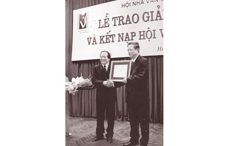 | Nhà thơ Hữu Thỉnh, Chủ tịch Hội Nhà văn Việt Nam trao tặng Giải thưởng văn học 2009 của Hội Nhà văn Việt Nam cho nhà phê bình văn học Đinh Quang Tốn. |